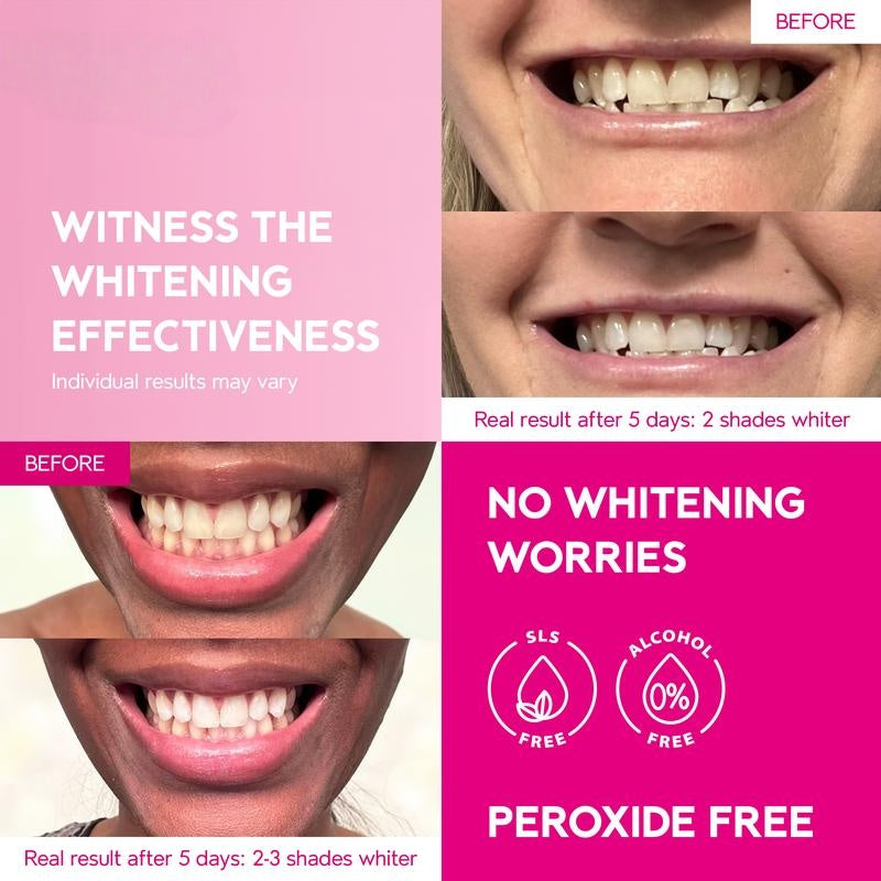 Our formula provides effective whitening while being gentle on your teeth and gums. It's also SLS-free (Sodium Lauryl Sulfate), ensuring a milder, non-irritating experience, and contains no alcohol, making it more safe and non-drying for everyday use.